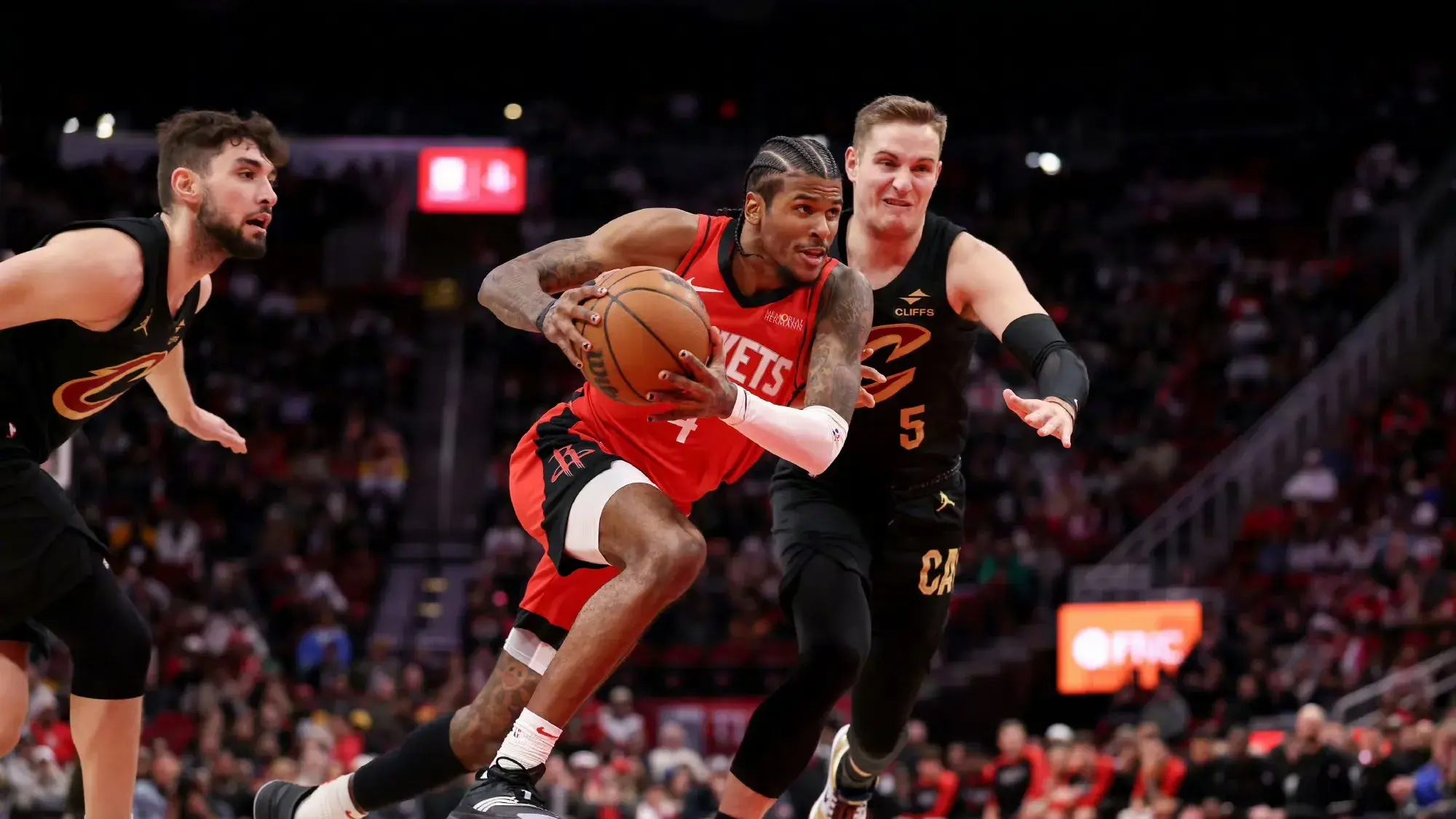 双方胜负手数次发生反转,范弗里特两记三分扳平,骑士再度领先,申京篮下强攻打进扳平,附加动作差点被判技术犯规,裁判回看录像判定为普通犯规,米切尔关键球不中,申京造成阿伦抢篮板犯规,骑士挑战失败,申京两罚全中火箭领先两分,时间仅剩4.5秒,暂停归来范弗里特战术犯规后,骑士第二次发球,加兰造成伊森三分犯规,裁判回放后判定伊森有垫脚动作,升级为恶意犯规,加兰三罚一掷,这个判罚对于火箭而言犹如晴天霹雳,加兰赛季罚球命中率高达90%,令人意外的是加兰在无人干扰的情况下前两罚全部罚丢,骑士仍然落后一分,米切尔高难度绝杀不中,火箭在主场惊险赢下这场比赛,赛后伊森大喜过望一路狂奔到更衣室。